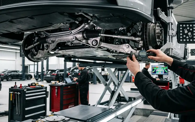 Assess shock absorber damping output, control arm bushing deflection, steering rack end play, ball joint axial movement, and subframe mounting rigidity to identify handling faults before structural deterioration advances.