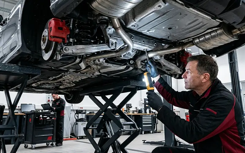 Examine chassis attachment points, exhaust mounting condition, underbody panel oxidation progression, and heat shield integrity to identify deterioration invisible during standard exterior visual assessment.