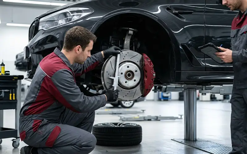 Measure pad thickness, rotor surface wear depth, caliper piston movement, and hydraulic circuit pressure integrity to confirm braking system safety standards across all four wheel positions.