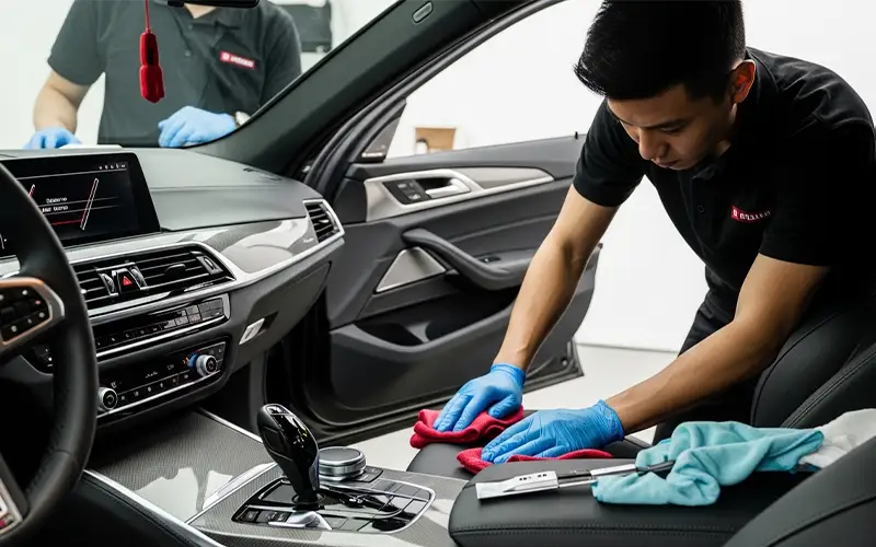 Apply protective film to high-wear interior surfaces, including door sill panels, centre console edges, touchscreen bezels, and gear selector surrounds, to prevent heat-related surface wear and UV-induced material degradation on modern German vehicle interiors during extended parking periods.