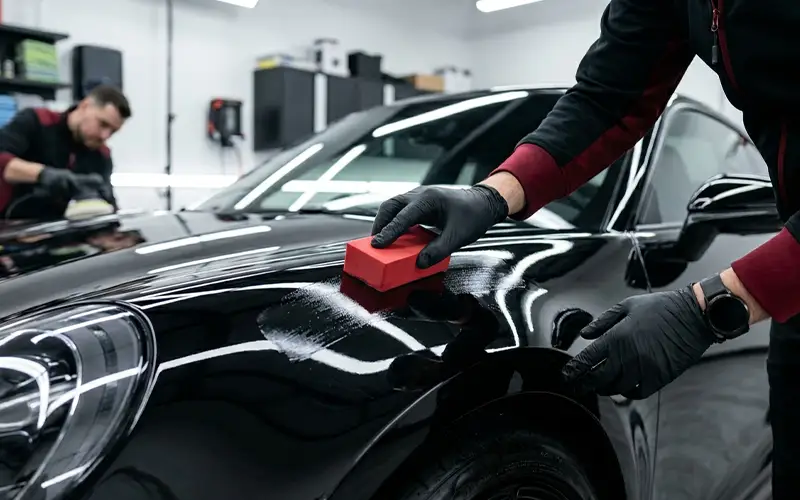 PPF is applied using computer-cut patterns and controlled squeegee techniques, ceramic coating is applied and cured under workshop conditions, and complete surface coverage is verified under controlled lighting before vehicle handover.