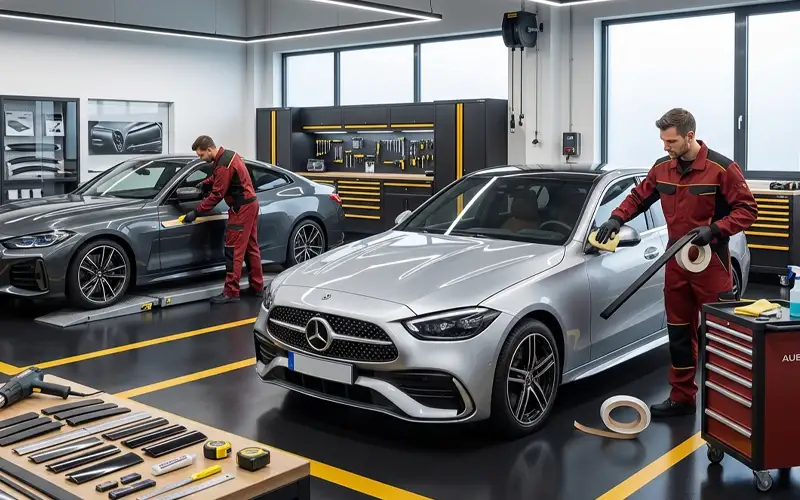 We install paint protection films, vinyl wraps, door-edge guards, and interior trim protection tailored to each German model.