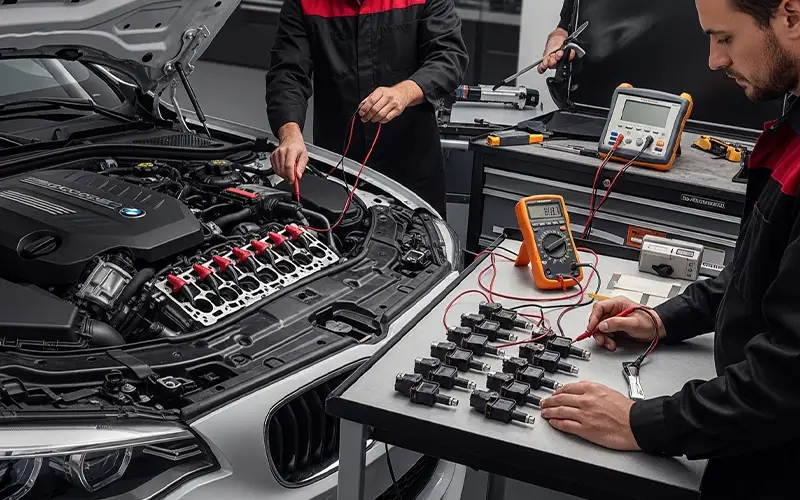 Ignition coils are tested alongside every spark plug replacement to detect weak output, insulation breakdown, and coil-to-plug mismatch causing repeat misfires on BMW, Mercedes-Benz, and Audi engines.