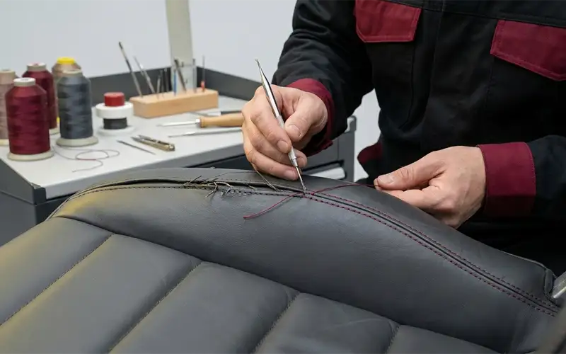 Reclose separated seam lines, broken thread patterns, and pulling stitch rows on perforated Nappa leather, Alcantara, and synthetic leather seat surfaces using original thread gauges and tension settings.